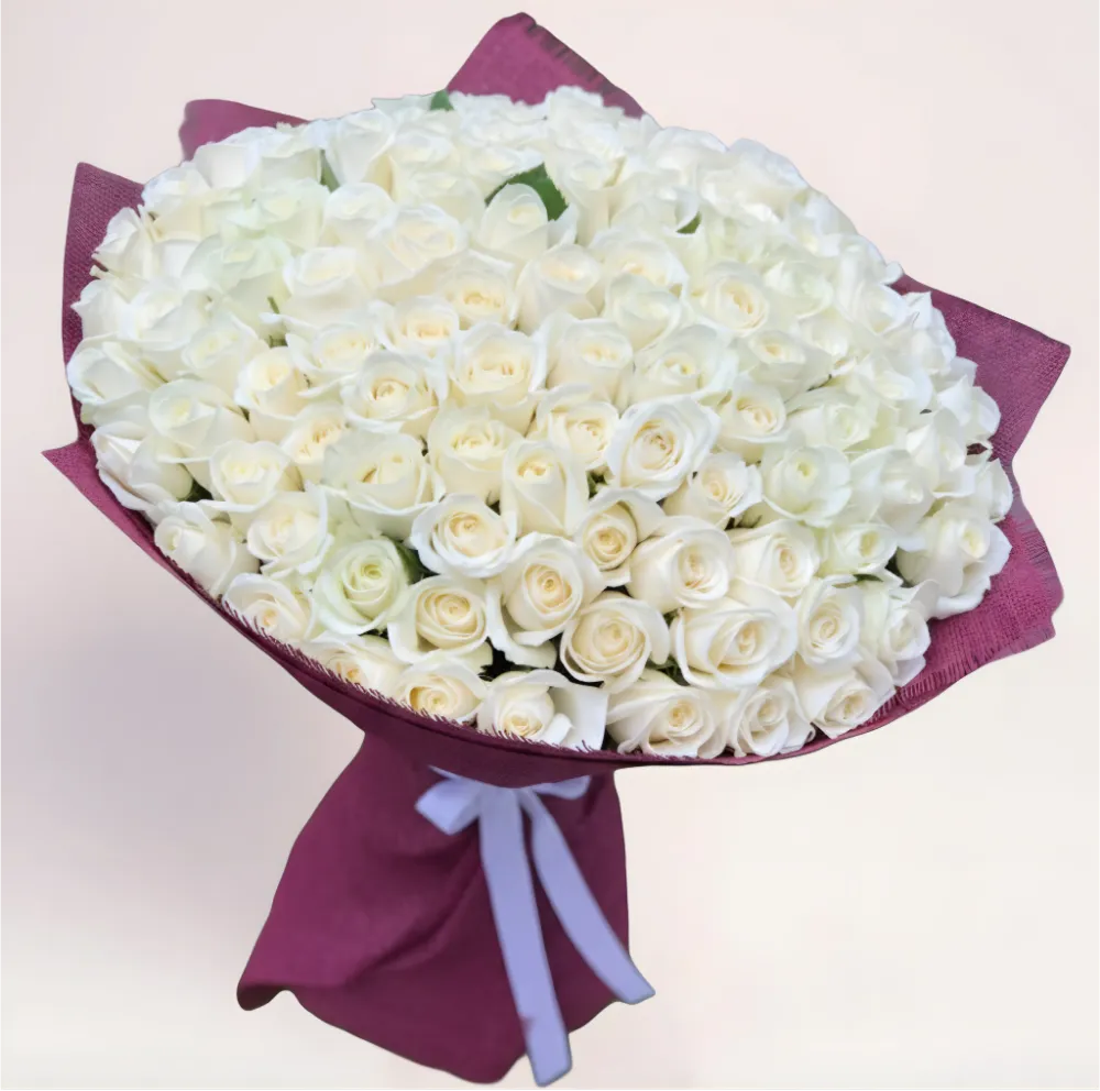 Белый цвет всегда ассоциируется с невинностью, искренностью и глубоким уважением. Поэтому подарить такой букет из 101 розы – отличная идея в независимости от повода. Крупные плотные бутоны белого цвета, собранные в виде купола, отлично подчеркнуты упаковочной бумагой винного цвета и светлой лентой, подпоясывающей охапку цветов.