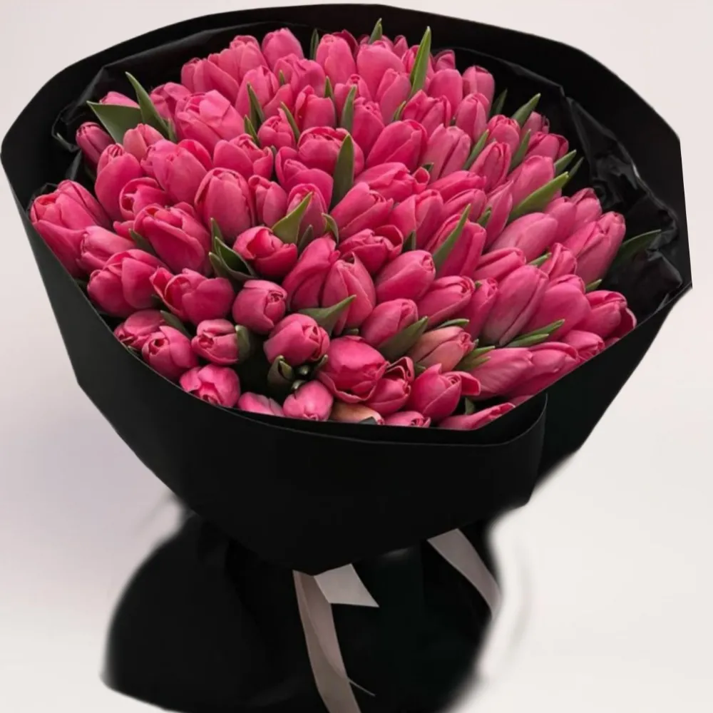 101 тюльпан — это о масштабе и уверенности. Такая композиция сразу воспринимается как «особый подарок», который не затеряется среди других. Становится центром пространства, притягивает взгляд и задает тон событию. Малиновые тюльпаны не выглядят ни слишком романтичными, ни официальными — это сбалансированный вариант, который хорошо работает в разных контекстах и не требует объяснений.