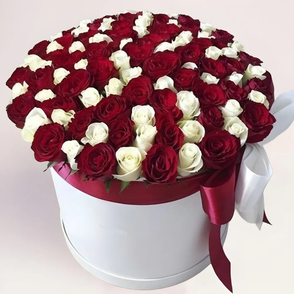 Заказывайте 101 бело-красную розу в коробке в нашем интернет-магазине. Флористы оперативно получат заказ и приступят к сборке композиции. Перед вручением курьеру, мы сфотографируем результат, чтобы вы оценили внешний вид полученного букета. Добавим открытку или подарок, если нужно. Ваша задача — только выбрать дату и время бесплатной доставки, все остальное мы сделаем за вас.