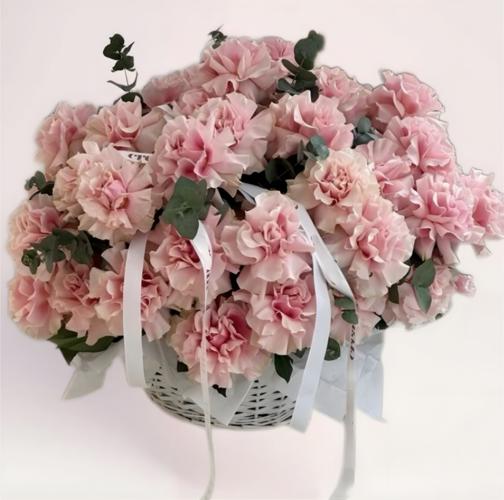 Композиция из 101 нежно-розовой французской розы в корзине выглядит воздушно: нежный оттенок напоминает утреннее сияние и вызывает ощущение спокойствия, тепла и гармонии.