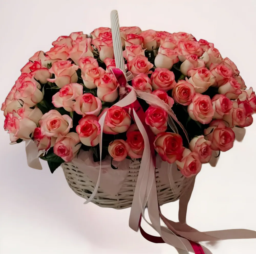 101 розовая роза в корзине – шикарный презент из отборных бутонов раскроет глубину ваших искренних чувств. Вы можете купить эффектную композицию, чтобы преподнести маме в знак благодарности. Крупные свежие розы с головокружительным ароматом дополнят предложение руки и сердца любимой девушке или станут вашим признанием в любви к супруге. Круглая плетеная корзина со светлыми выступающими уголками бежевой бумаги и бантом из двухсторонней ленты выглядит изысканно. Ее заполняют крупные плотные нежно-розовые бутоны с яркими краешками слегка развернутых лепестков. Сделайте заказ на 101 розовую розу, укажите адрес доставки – и мы поможем вам сделать незабываемый сюрприз.