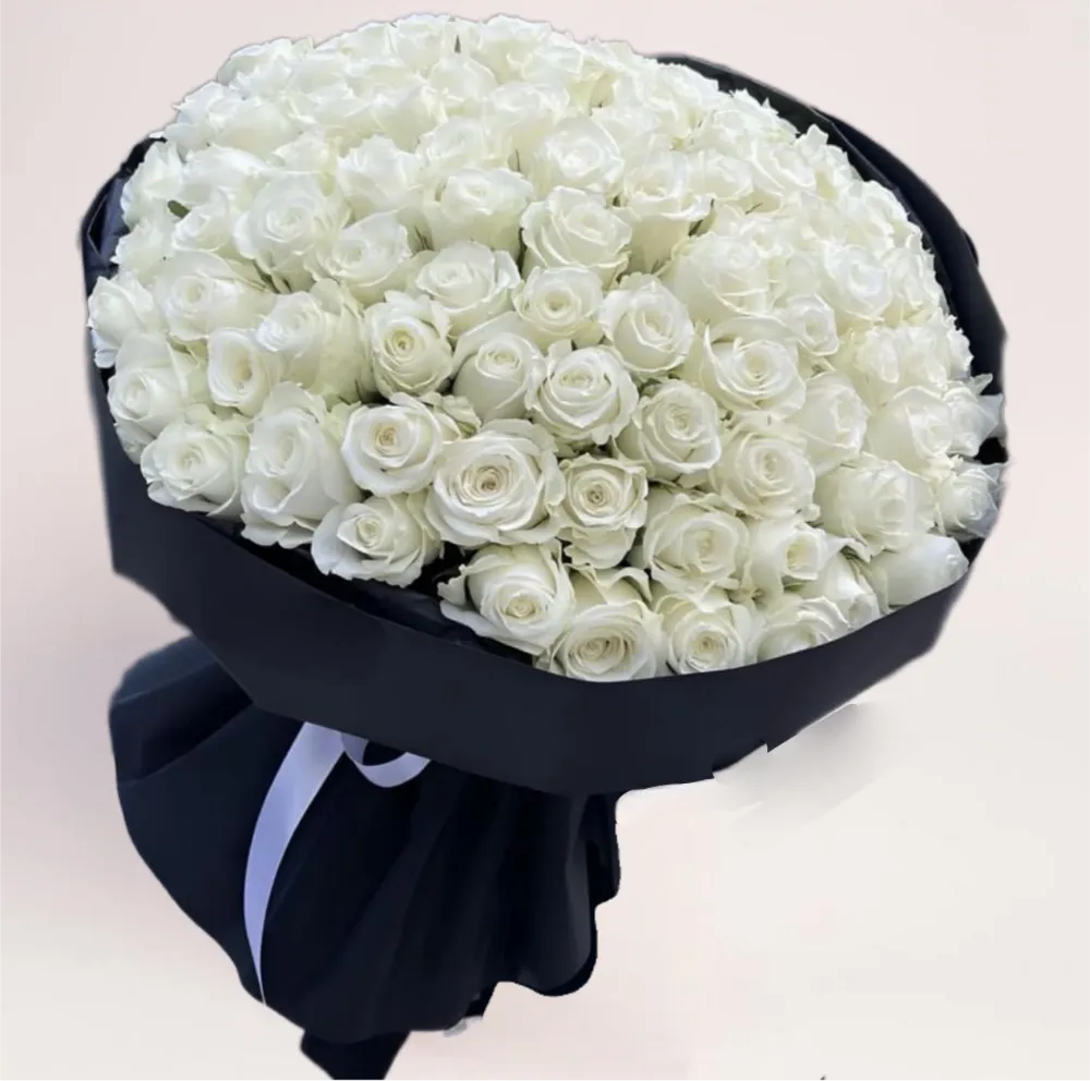 Композиция из 101 сортовой розы Вайт Наоми отличается шарообразной формой, создает эффект идеального ровного объема. Это букет подходит тем, кто ценит лаконичность, премиальность и безупречную эстетику.
