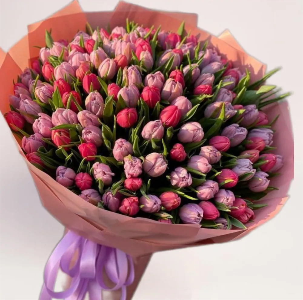 Мы контролируем каждый этап: от подбора цветов до момента вручения. Профессиональные флористы тщательно отбирают свежие соцветия и собирают их в крепкий букет. Предлагаем вам заказать композицию из 101 тюльпана микс на выгодных условиях онлайн или по телефону. Курьеры бережно доставят заказ по указанному адресу в оговоренное время.