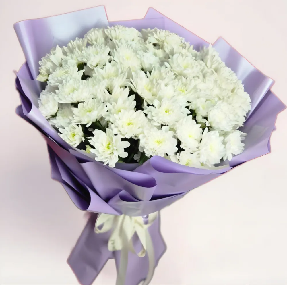 Букет из 11 белых хризантем выглядит светло, объемно и очень аккуратно. Белоснежные цветы с плотными лепестками собраны в гармоничную композицию и оформлены в нежную упаковку. Нежно-сиреневая бумага подчеркивает естественную красоту соцветий. Такой букет уместен для искренних слов, важных моментов и спокойных эмоций без лишнего пафоса. Композиция хорошо держит форму, долго остается свежей и выглядит презентабельно с первого взгляда. Заказывая у нас, вы получаете аккуратно собранный букет, фото перед отправкой и бесплатную доставку по Алматы 24/7.