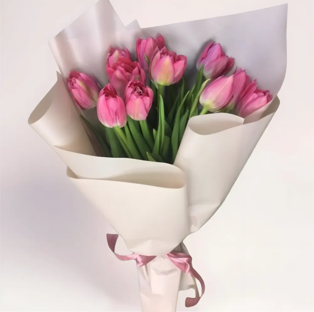 Розовые тюльпаны олицетворяют заботу, искренность и теплые чувства, которые не нуждаются в громких словах. Они уместны там, где важна деликатность и уважение к эмоциям другого человека. Количество одиннадцать усиливает этот смысл: это знак особого отношения, гармонии и внутренней близости. Такой букет выглядит как продуманный жест, а не спонтанная покупка.