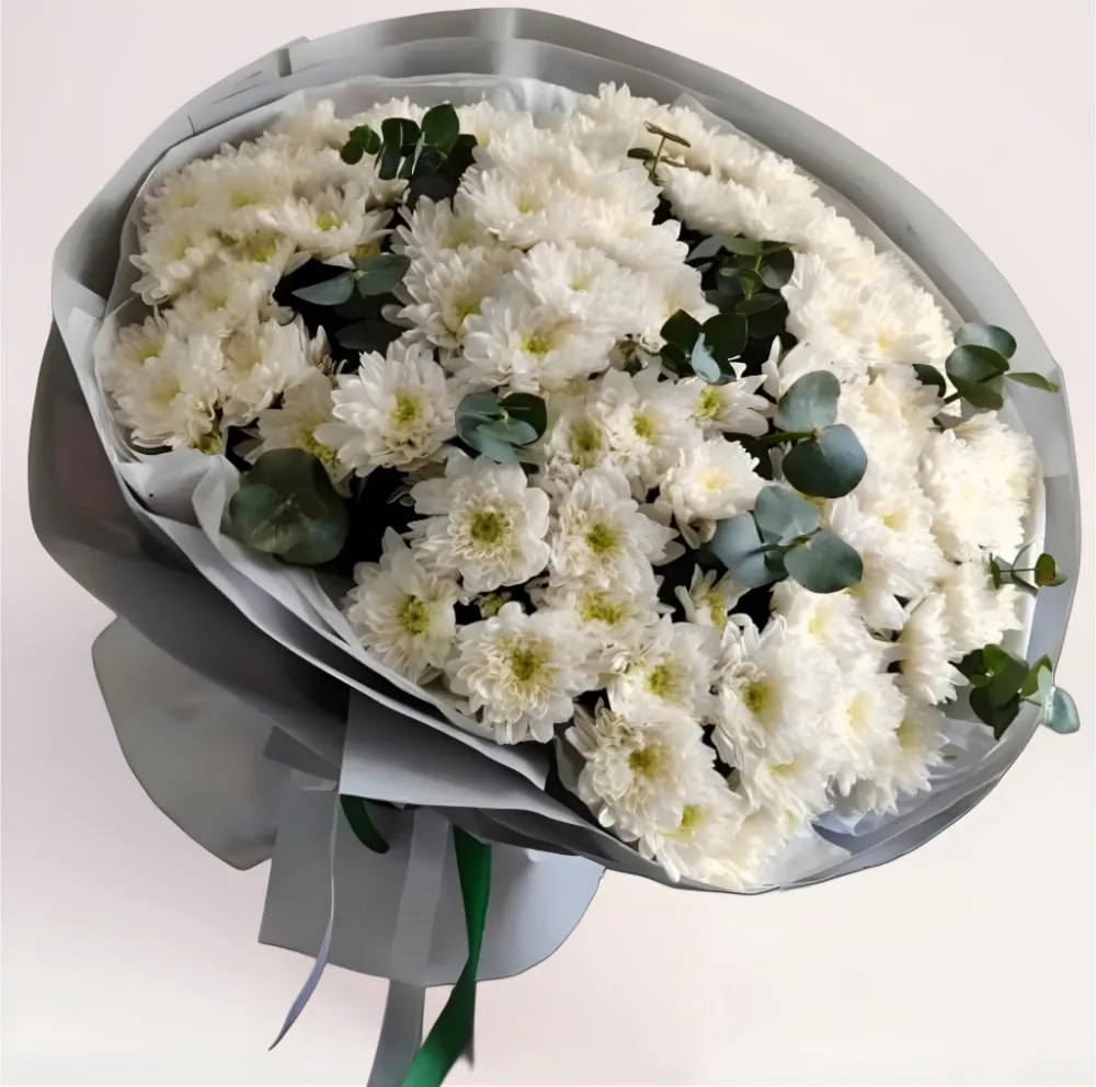Количество 25 делает букет по-настоящему солидным и презентабельным. Это выбор, который говорит о внимании к деталям, уважении и серьезности намерений, подчеркивая важность события или человека. Белый цвет хризантем ассоциируется с честностью, благородством и чистыми пожеланиями, а в большой композиции он выглядит особенно эффектно. Именно такое количество позволяет создать идеальный баланс между масштабом и сдержанностью.