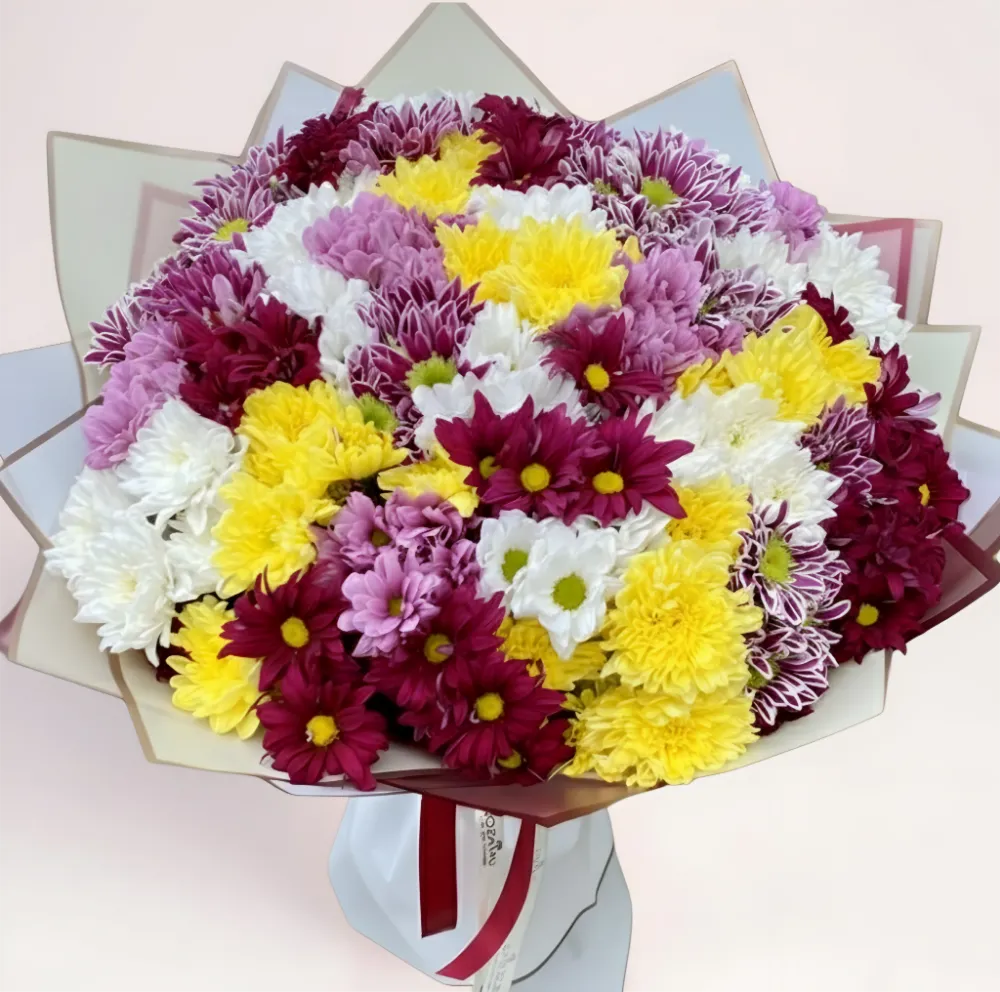 31 хризантема микс — это яркая, многогранная композиция, создающая ощущение настоящего праздника. Сочетание белых, желтых, розовых и глубоких бордовых оттенков формирует насыщенный, объемный букет, который выглядит выразительно. Такое количество цветов создает масштаб и презентабельность, подчеркивая особенность момента. Букет уместен для важных событий и искренних поздравлений, где эмоции имеют значение. День учителя, поздравление с профессиональным праздником, юбилеи и семейные торжества – букет найдет место в любом из этих случаев. Можно купить с бесплатной доставкой по Алматы, которая работает 24/7. Контроль качества, фотоотчет перед доставкой.