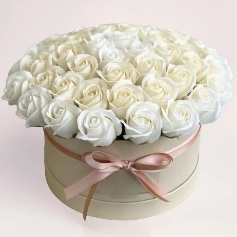 Белые розы всегда воспринимаются как знак уважения, чистых намерений и искреннего отношения. В композиции из 35 белых роз в коробке они выглядят особенно целостно: без излишней эмоциональности, но с четким посылом. Шляпная коробка придает букету современный вид. А также позволяет сохранить форму композиции в течение всего дня — дома, в офисе или во время вручения. Соцветия долгое время будут сохранять свежесть благодаря специальной влажной основе, которая размещается нашими флористами внутрь коробки.