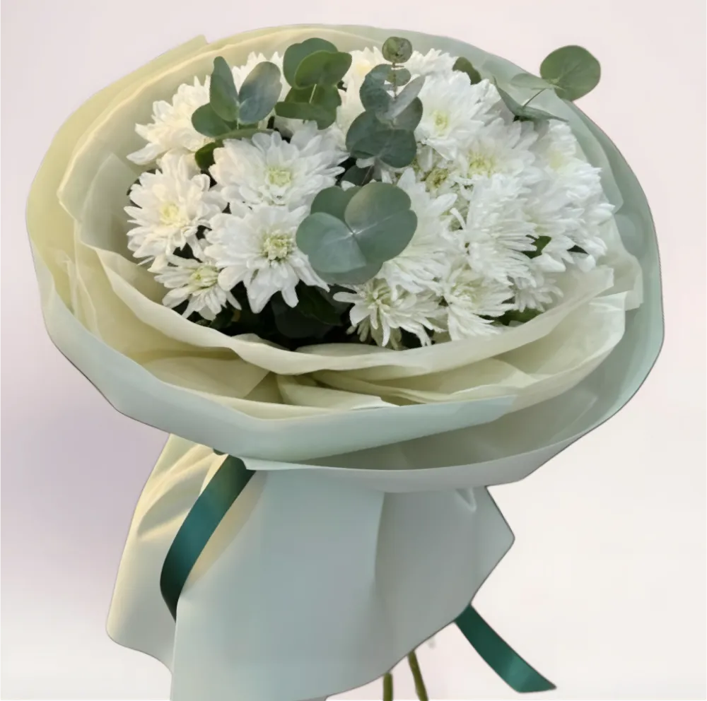 Этот букет из 5 белых хризантем Алматы создан для моментов, когда важна чистота намерений и сдержанная красота. Большие лепестки формируют объемные, пушистые цветы. Они выглядят свежо и дорого. Серебристо-зеленый декор добавляет композиции глубины, а многослойная упаковка нежного оттенка подчеркивает форму букета и защищает его при доставке.