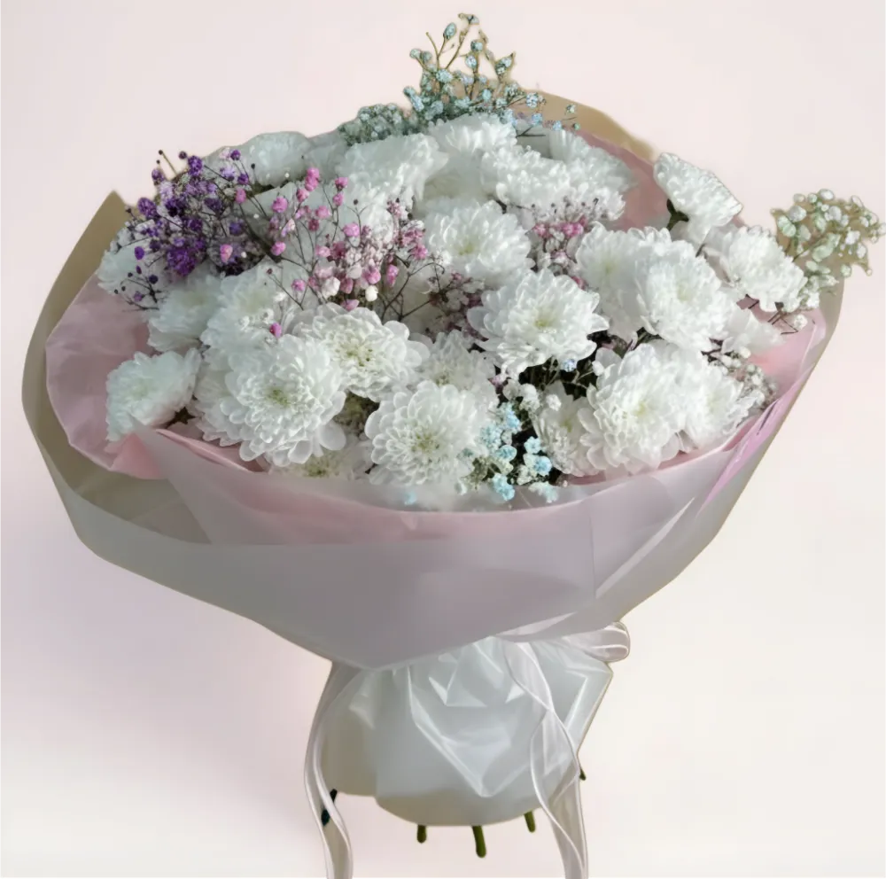 Букет из 5 хризантем с гипсофилой Алматы создает ощущение нежности с первого взгляда. Пышные белые соцветия хризантем гармонично сочетаются с мелкой, невесомой гипсофилой, придающей композиции объем и воздушность. Мягкая упаковка пастельного оттенка подчеркивает форму букета и делает его уместной как для личных, так и для официальных поводов.