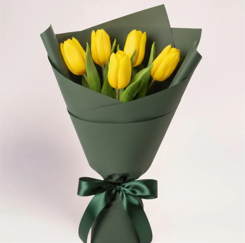 Этот букет выглядит динамично и современно. Желтые тюльпаны с ровными стеблями собраны компактно, без перегрузки деталями, что делает композицию легкой для восприятия. Матовая зеленая упаковка «собирает» букет из 5 желтых тюльпанов в единую форму. Атласная лента в тон выглядит сдержанно и аккуратно. Ничего лишнего, только чистая эстетика.