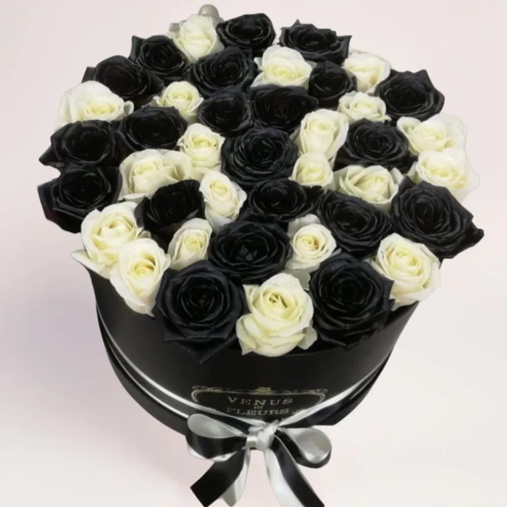 51 черно-белая роза в коробке выглядит взвешенно и продуманно до мелочей. Черные розы как символ глубины и драматизма, белые — балансируют и смягчают общее впечатление. Вместе они формируют ритмичный узор, который привлекает внимание с первого взгляда. Шляпная коробка в темном оттенке усиливает контраст и делает букет целостным и аккуратным.