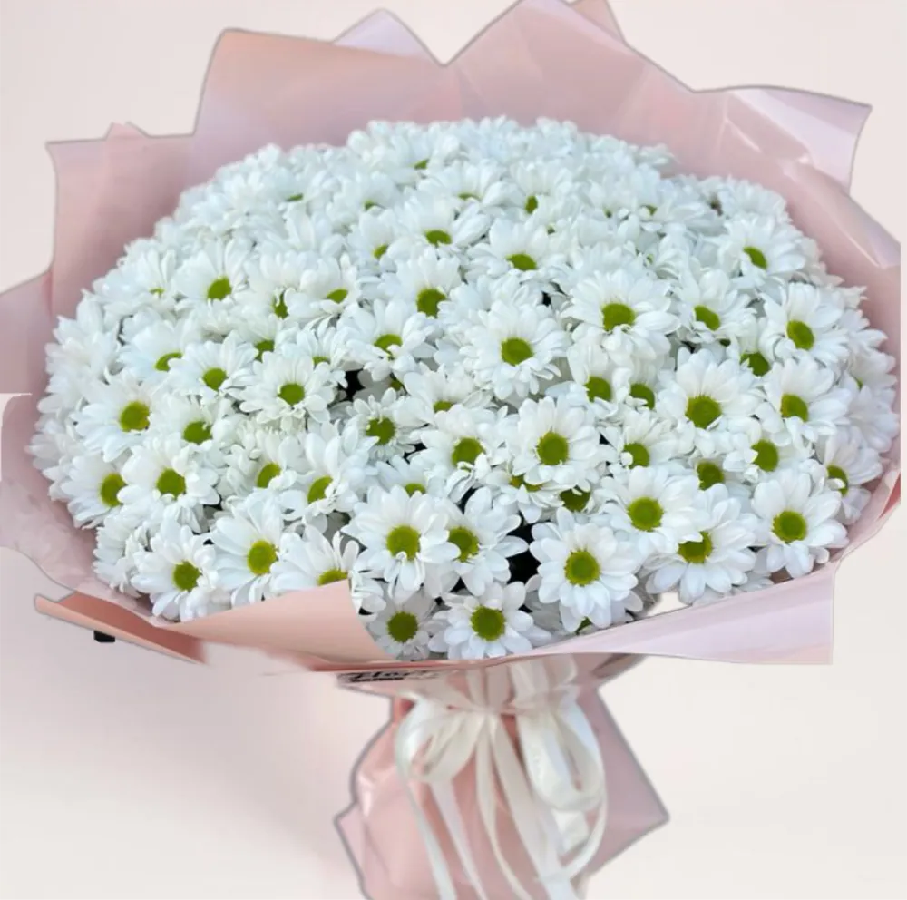 51 ромашковидная хризантема — роскошный белый букет с открытыми зелеными серединками, который выглядит легко, свежо и объемно. Его «ромашковый» характер создает ощущение естественной искренности, тепла и доверия, а большое количество цветов формирует настоящий вау-эффект. Число 51 подчеркивает масштаб внимания и серьезность жеста, делая подарок по-настоящему значимым. Это идеальный выбор для важного поздравления или сильного признания. Можно купить с бесплатной доставкой по Алматы 24/7 и добавить подарок — шоколад, конфеты или мягкую игрушку.