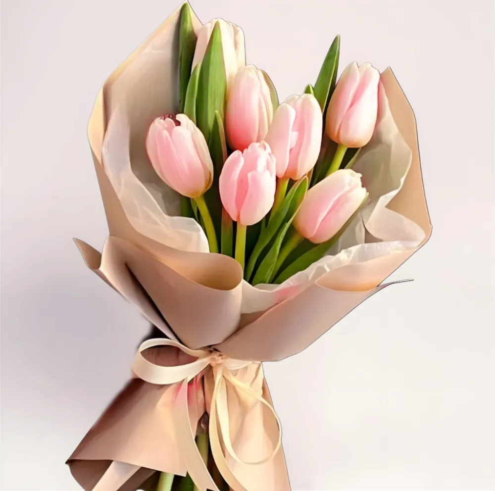 Этот букет выглядит легким и естественным. 7 розовых тюльпанов собраны так, чтобы каждый бутон оставался заметным, не теряясь в общем объеме. Цветы имеют плавные линии, а их цвет ассоциируется с теплом, молодостью и искренними эмоциями. Полупрозрачная упаковка мягко обволакивает букет, подчеркивая его воздушность, а светлая лента завершает композицию сдержанным, аккуратным акцентом.