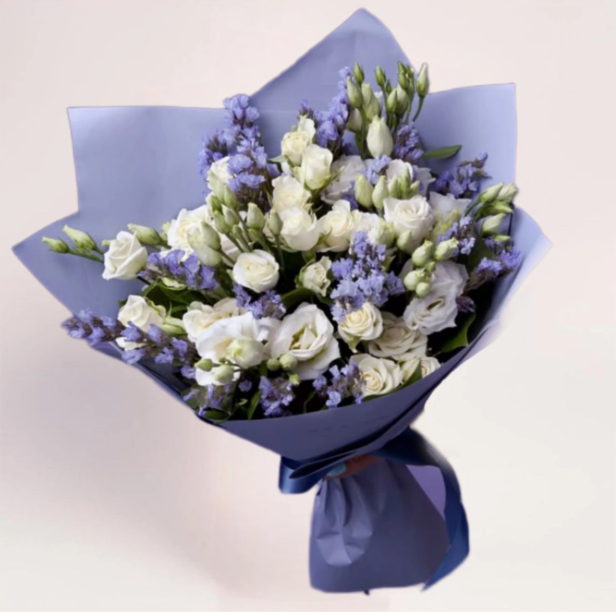 Нежный микс белой эустомы и статицы в дизайнерской упаковке. Бесплатная доставка по городу. Благодаря нашим точкам во всех районах города, доставим ваш заказ максимально быстро. Свежесть гарантирована!