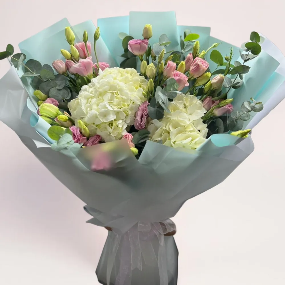 Композиция собирается вручную профессиональными флористами из свежих цветов, которые сохраняют привлекательный вид и аромат. Гортензия создаёт выразительный акцент, эустома добавляет нежность, а зелень придаёт букету естественность и завершённость. Стильная упаковка подчёркивает премиальный характер букета и делает его готовым подарком без дополнительного оформления.