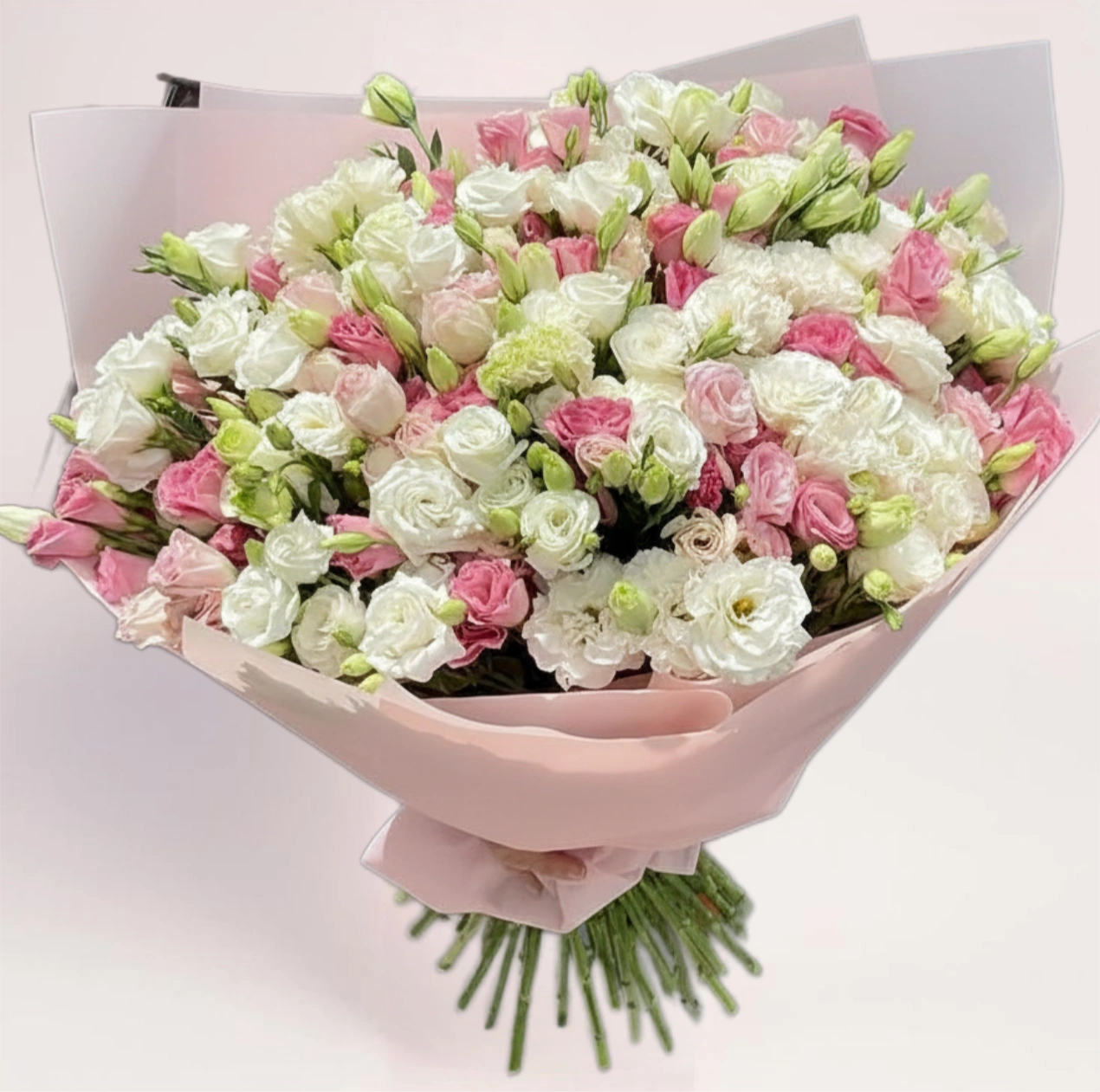 Букет собран из свежей эустомы (лизантуса): сочетание белых и розовых бутонов создаёт мягкий контраст и эффект «облака». Композиция получается максимально пышной и фотогеничной.