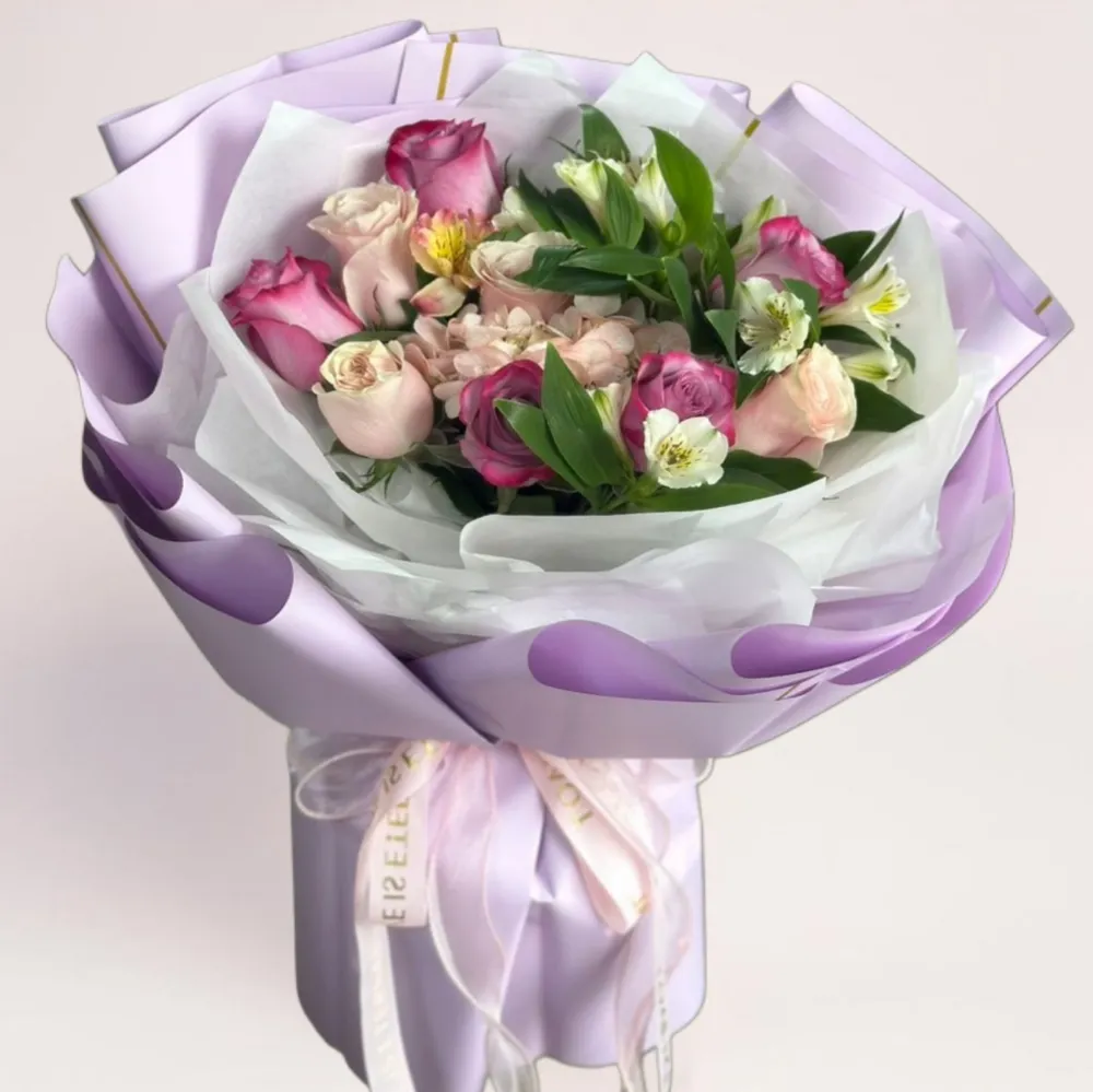 Нежный дизайнерский букет с розами, альстромерией и декоративной зеленью в светлой сиреневой упаковке. Авторская композиция с мягкой цветовой палитрой и аккуратной сборкой — идеальный вариант для подарка и доставки цветов по городу.