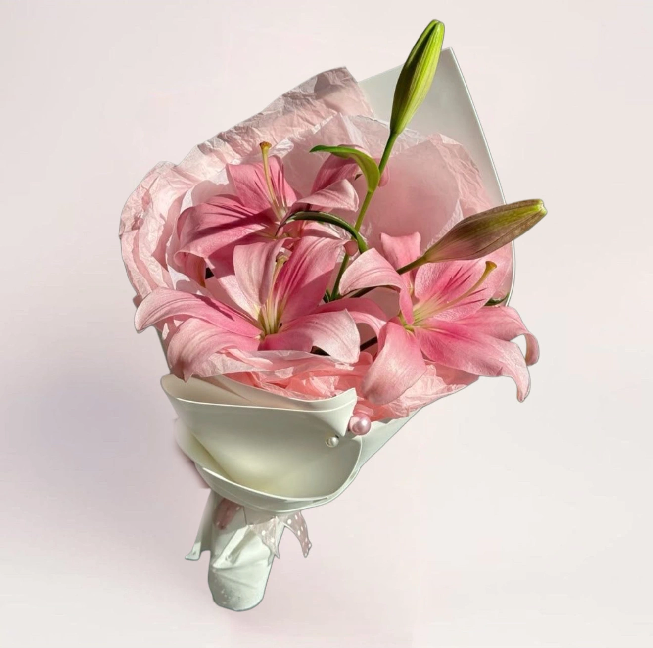 Розовые лилии ассоциируются с заботой, искренностью и светлыми эмоциями. Такой букет не стремится поразить масштабом — он работает через настроение. Сочетание открытых цветов и закрытых бутонов добавляет глубину и создает ощущение продуманности. Композиция выглядит гармонично, не перегружена, с четким акцентом на естественную красоту каждой лилии.
