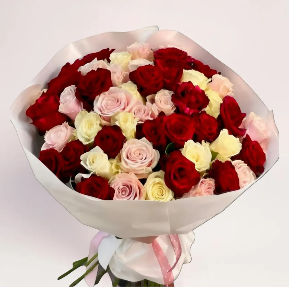 Букет из 51 микс розы – идеальный подарок любимой женщине. Его можно подарить невесте, жене, маме, сестре, подруге. Пышная объемная композиция составлена из крупных красных, розовых и желто-кремовых бутонов. Белая упаковочная бумага и светло-розовая лента в кокетливый горошек не отвлекают внимания от красоты цветов, а служат гармоничным обрамлением для нее. Трехцветная композиция символизирует нежность, любовь, глубокое уважение и чистоту намерений. Предлагаем вам купить букет из 51 розы микс в Алматы для презента по любому поводу, чтобы вызывать wow-эмоции. Наш курьер доставит получателю ваш подарок бесплатно.
