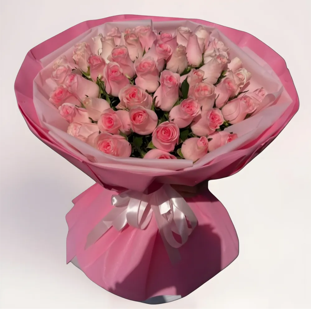 Этот букет — воплощение мягкости и женственности. 51 розовая роза с различными оттенками пудры и карамели создают гармоничный плавный градиент. Бутон плотный, аккуратный, без повреждений — именно такой, который выглядит идеально на фото и в реальности. Упаковка в тон усиливает сладкий характер композиции и делает ее визуально еще пышнее.