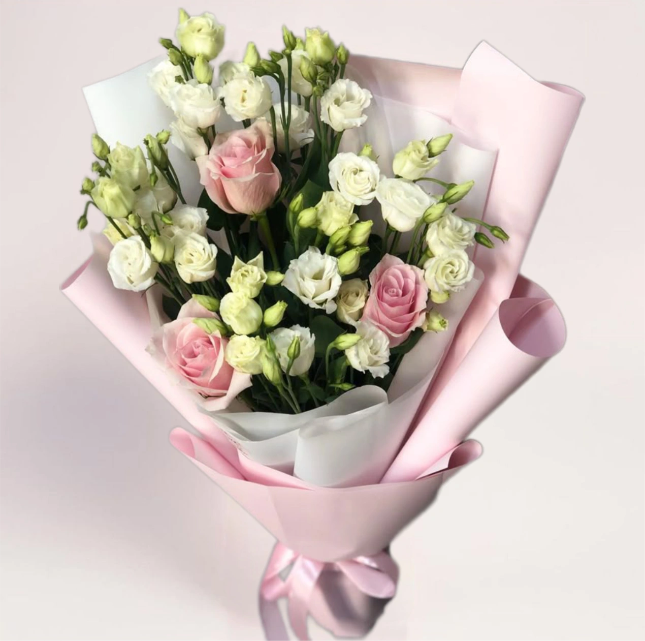 Букет собран из свежей эустомы и аккуратных роз в спокойных светлых оттенках.