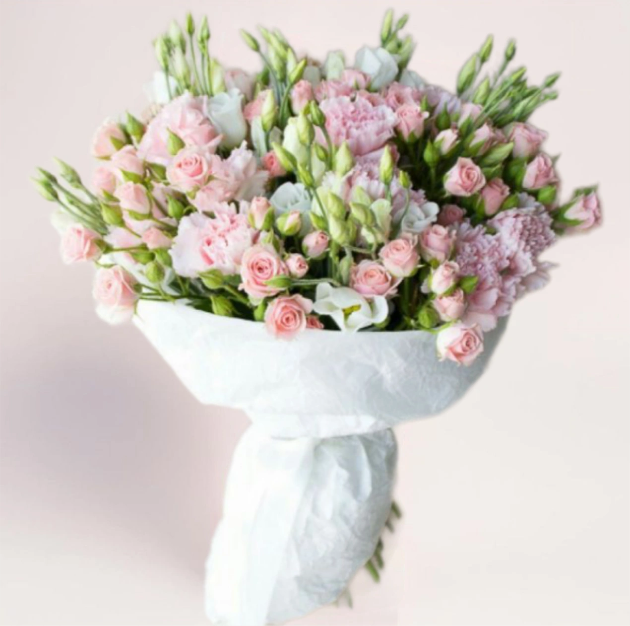Объёмная композиция из свежей эустомы и кустовой розы в мягких пастельных оттенках. Букет выглядит максимально пышно за счёт большого количества бутонов и плотной сборки, при этом остаётся лёгким и аккуратным.
