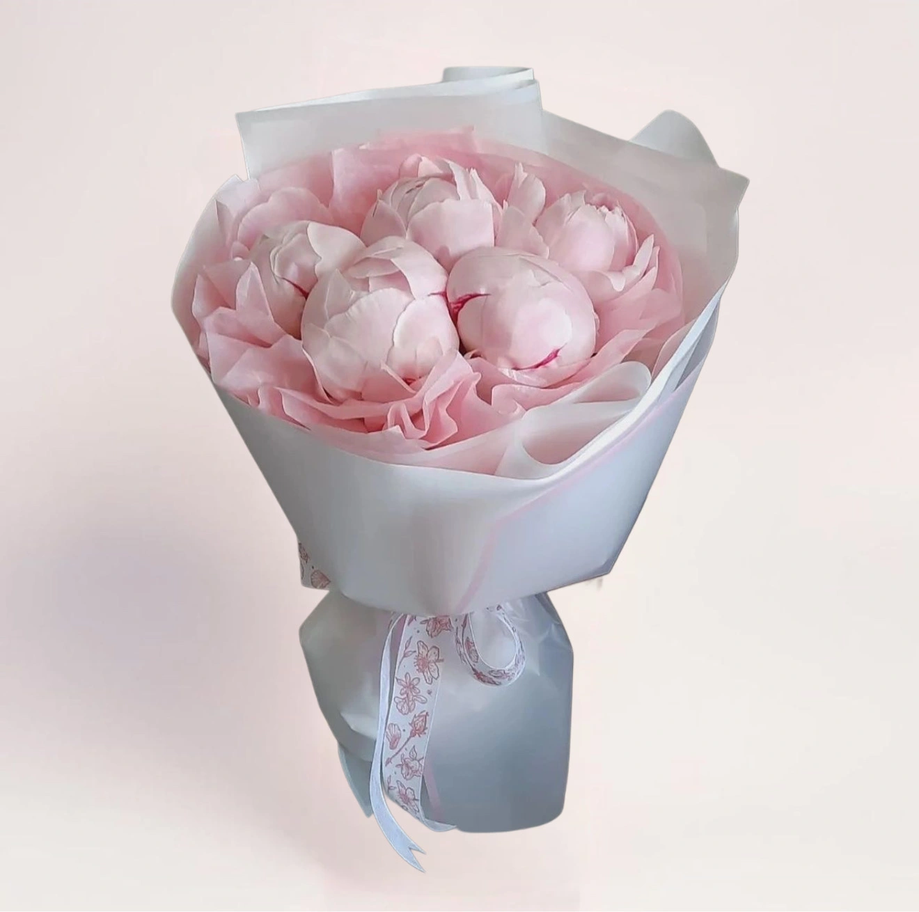 Пионы известны своими многослойными лепестками и способностью постепенно раскрываться. В этом букете они выглядят особенно изящно: светло-розовые оттенки добавляют легкости, а плотные бутоны долго сохраняют форму. Такая композиция хорошо стоит в вазе и со временем становится еще пышнее, не теряя эстетики.