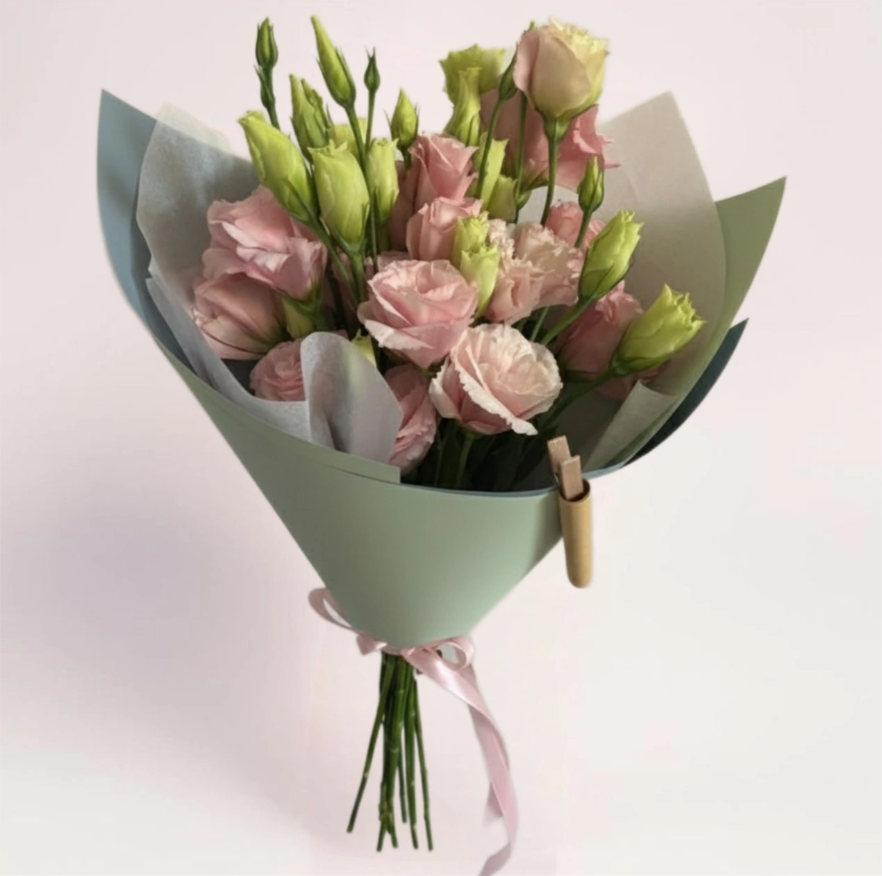 Нежный букет из розовой эустомы с аккуратной формой и мягкой упаковкой.