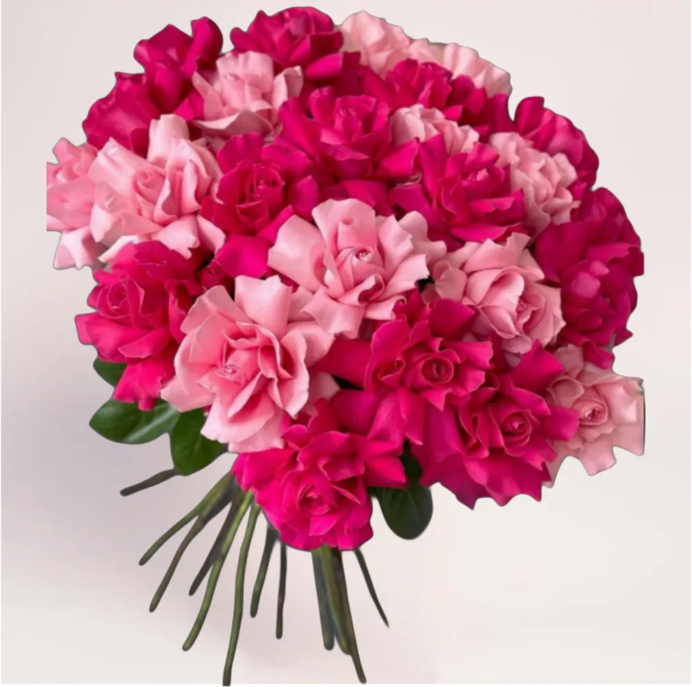 Дизайнерский букет, полностью собранный из роз двух гармоничных оттенков — насыщенного розового и нежно-пудрового. Контраст цветов создаёт объёмную, динамичную композицию, которая сразу привлекает внимание и выглядит по-настоящему празднично.