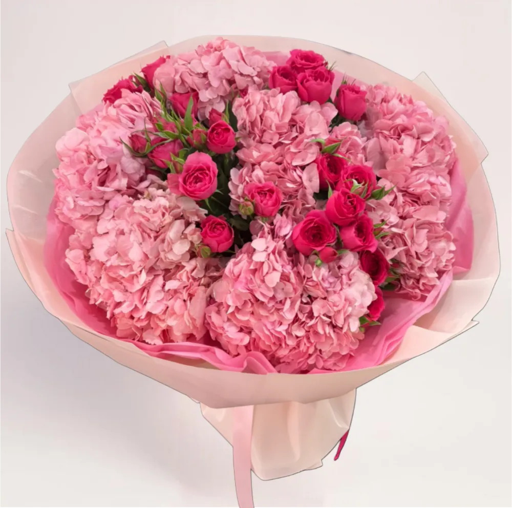 Авторский букет от флориста с роскошным объёмом и выразительной цветовой подачей. В композиции сочетаются пышные соцветия розовой гортензии и аккуратные кустовые розы насыщенного оттенка, создавая воздушный, но в то же время насыщенный и цельный образ.