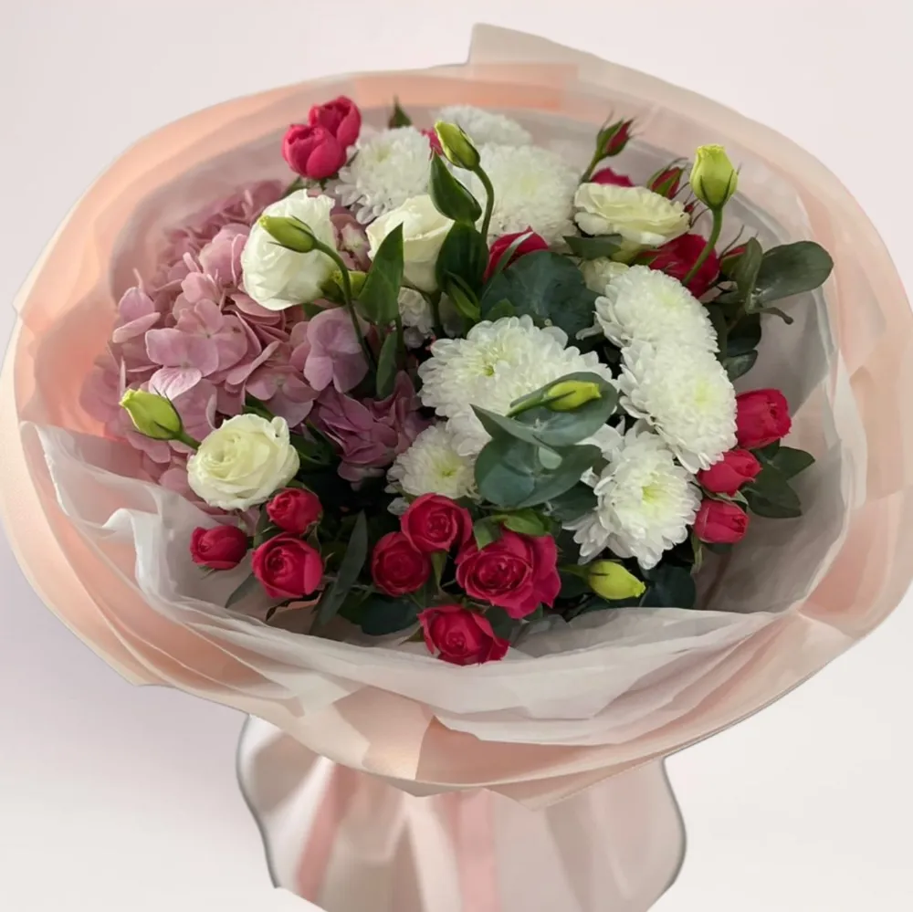 Авторский дизайнерский букет, в котором гармонично сочетаются гортензия, кустовые розы, эустома и белые хризантемы. Мягкая цветовая палитра, живые текстуры и продуманная форма делают композицию лёгкой, элегантной и визуально объёмной.
