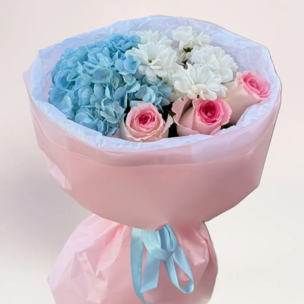 Если вы хотите купить цветы с бесплатной доставкой, обратите внимание на этот нежный дизайнерский букет. В композиции сочетаются голубая гортензия, розовые розы и белые хризантемы, создавая ощущение лёгкости и гармонии. Букет подойдёт для дня рождения, романтического подарка или знака внимания без повода. Мы используем только свежие цветы и обеспечиваем быструю доставку цветов по городу.