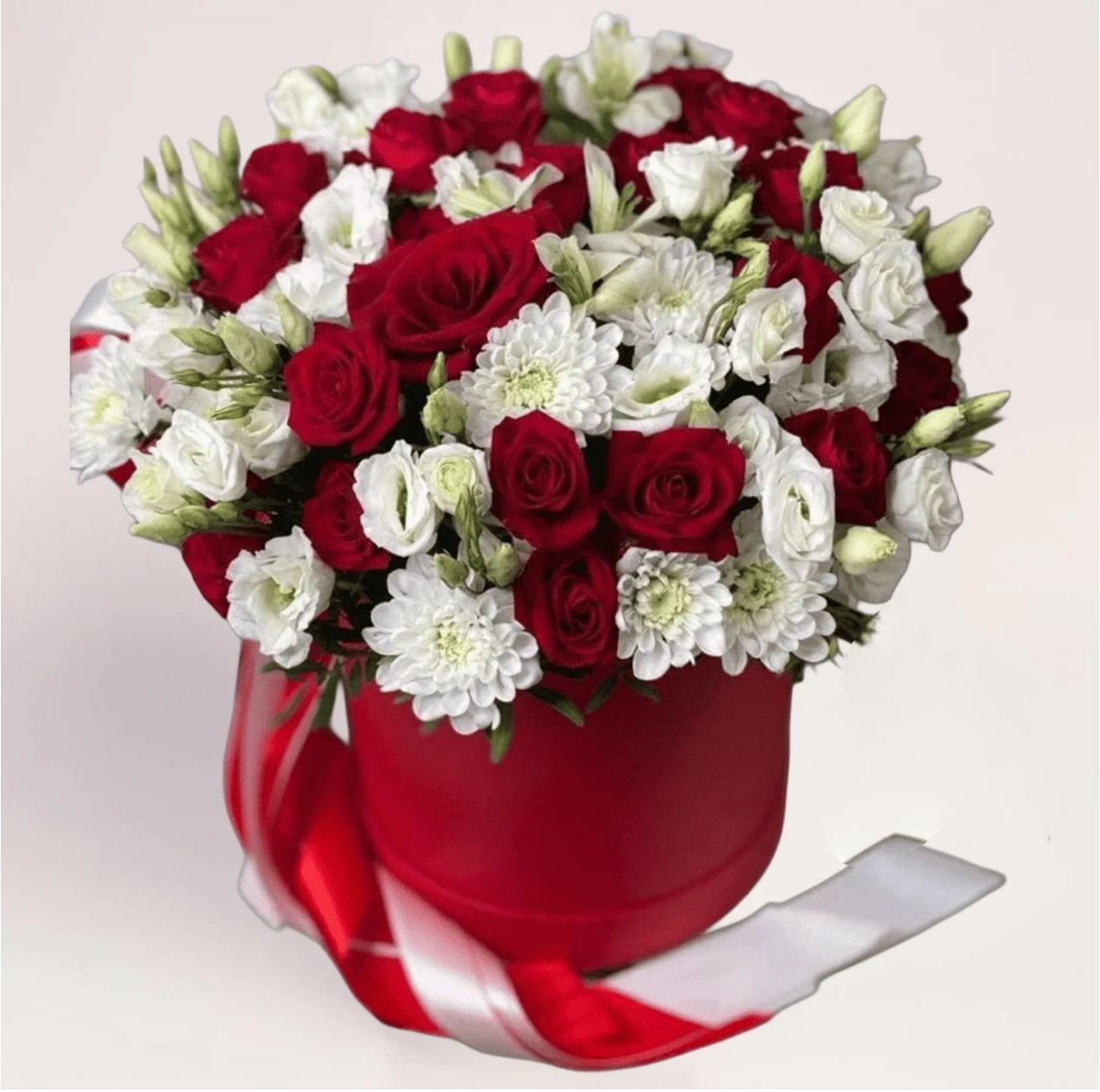 Цветы в красной коробке с красными розами, белыми хризантемами и эустомой — универсальный и эффектный подарок с бесплатной доставкой.