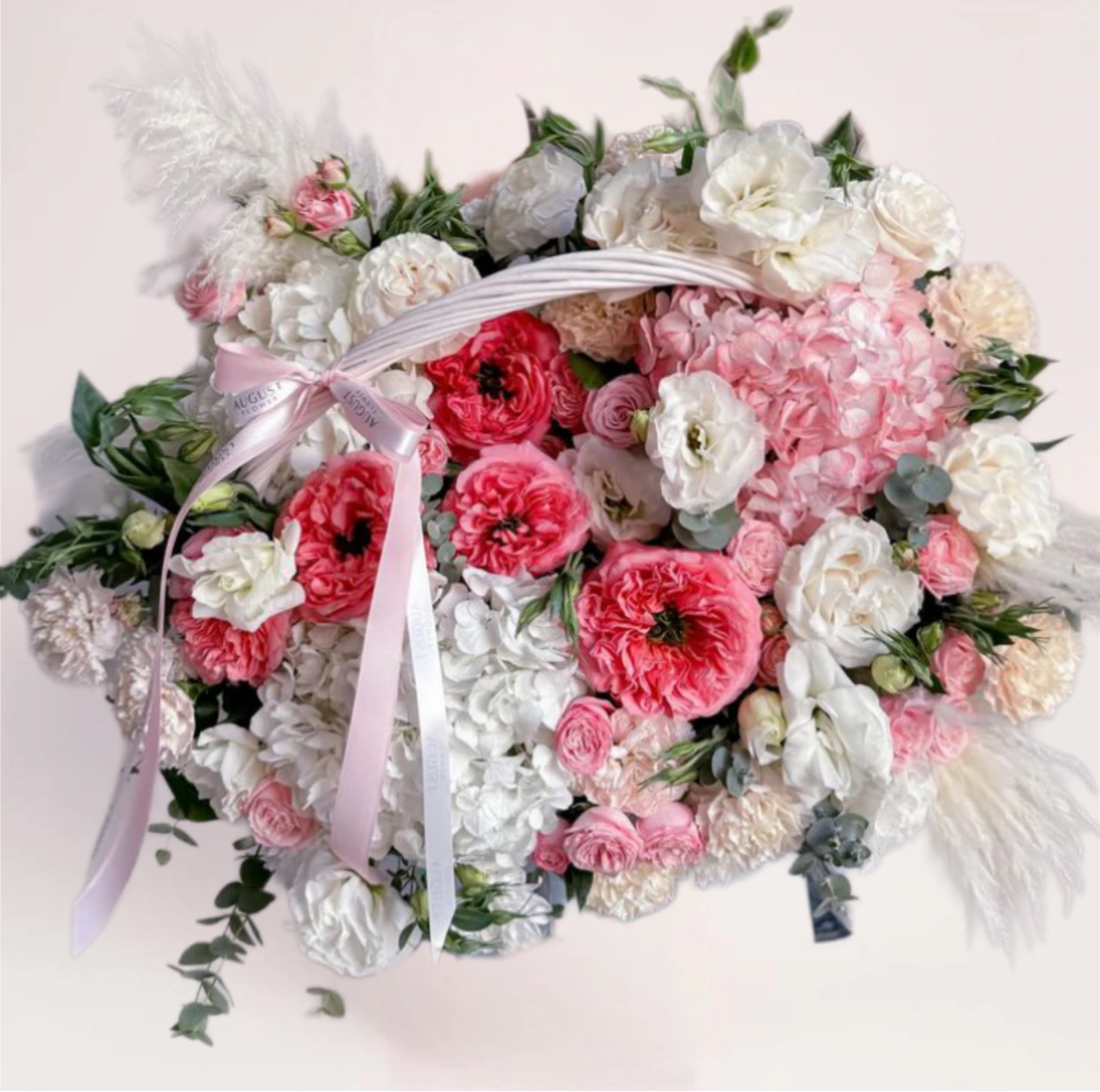 Цветы в корзине с бесплатной доставкой — объёмная композиция в нежных пастельных оттенках с розами, гортензией и сезонными цветами. Корзина выглядит воздушно и статусно, сразу создаёт ощущение заботы и внимания.