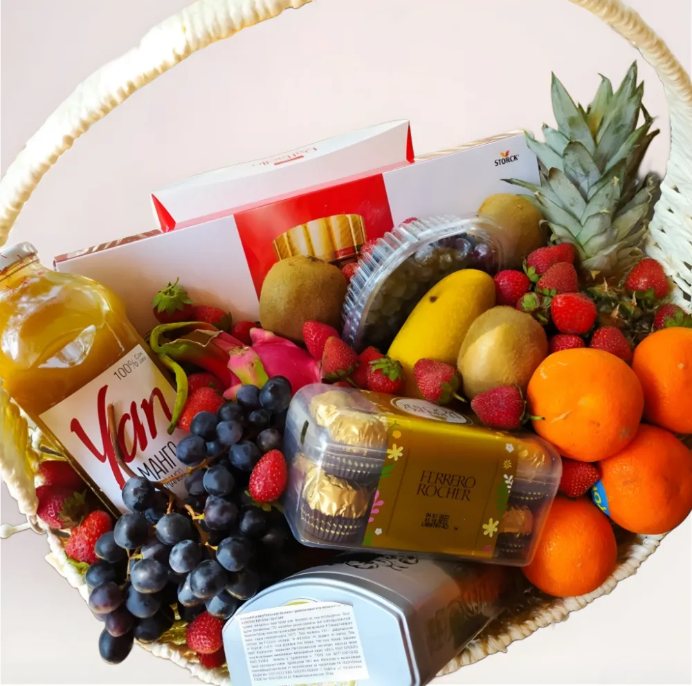 Фруктовая корзина подойдёт для поздравления близких, коллег, партнёров или в качестве статусного подарка на праздник. Сочетание свежих фруктов и сладостей делает её универсальным вариантом для взрослых и семейных подарков.