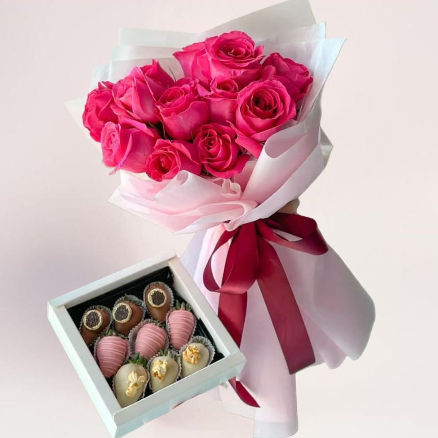 Комбо “Розы + клубника в шоколаде” — букет свежих роз и клубника в шоколадной глазури в коробочке. Бесплатная и быстрая доставка, плюс бонус на следующие заказы.
