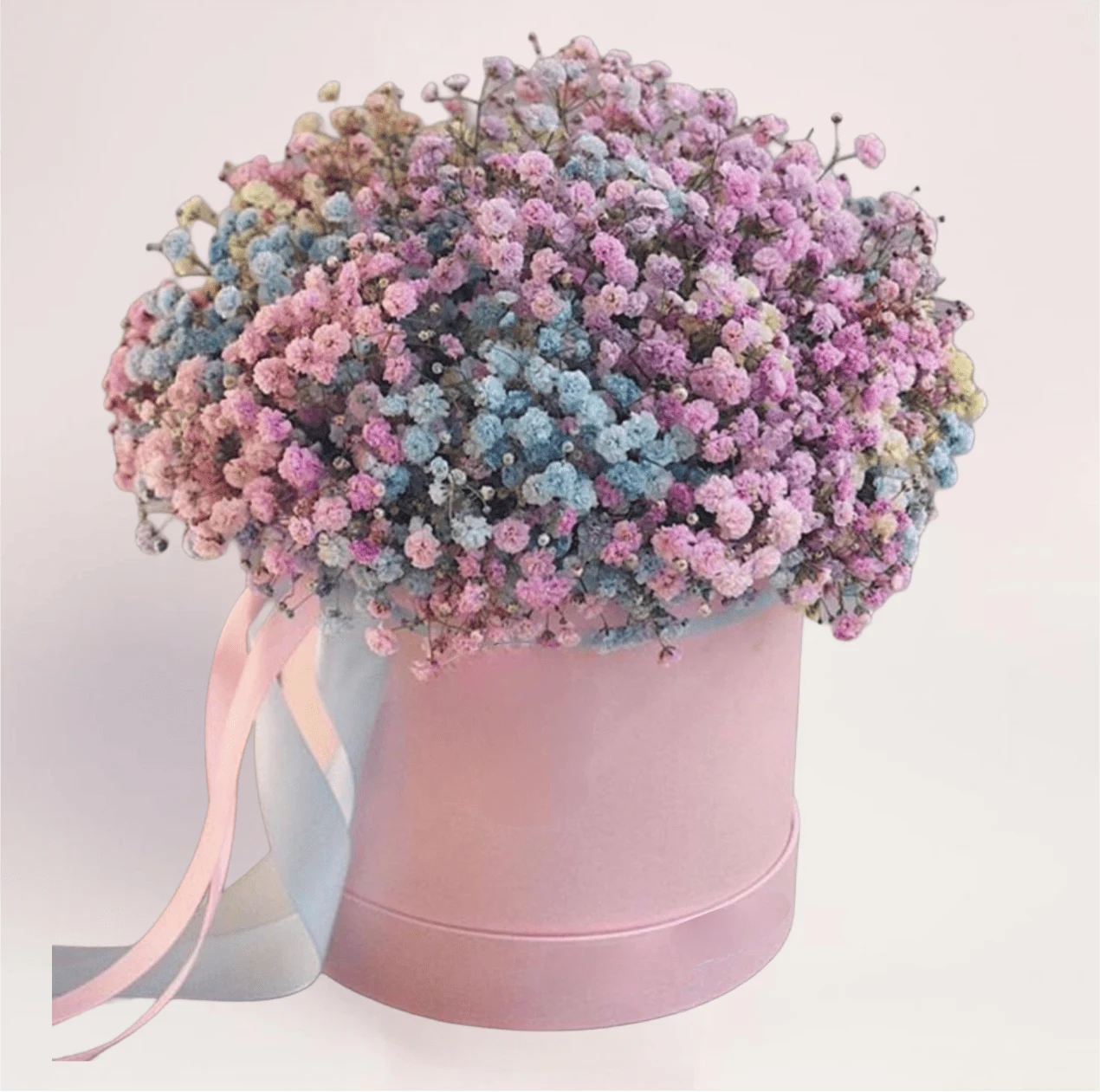 В композиции используется окрашенная гипсофила в нежных розовых, голубых и сиреневых оттенках. Цветы собраны в плотную шляпную коробку с флористической губкой, что позволяет сохранить форму и свежий внешний вид.