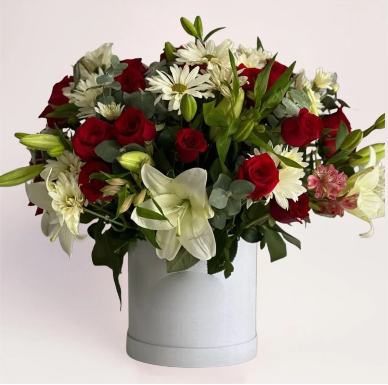 Эта композиция сочетает выразительность красных роз и благородную нежность белых лилий. Хризантемы и зелень добавляют объём и делают букет живым и гармоничным.