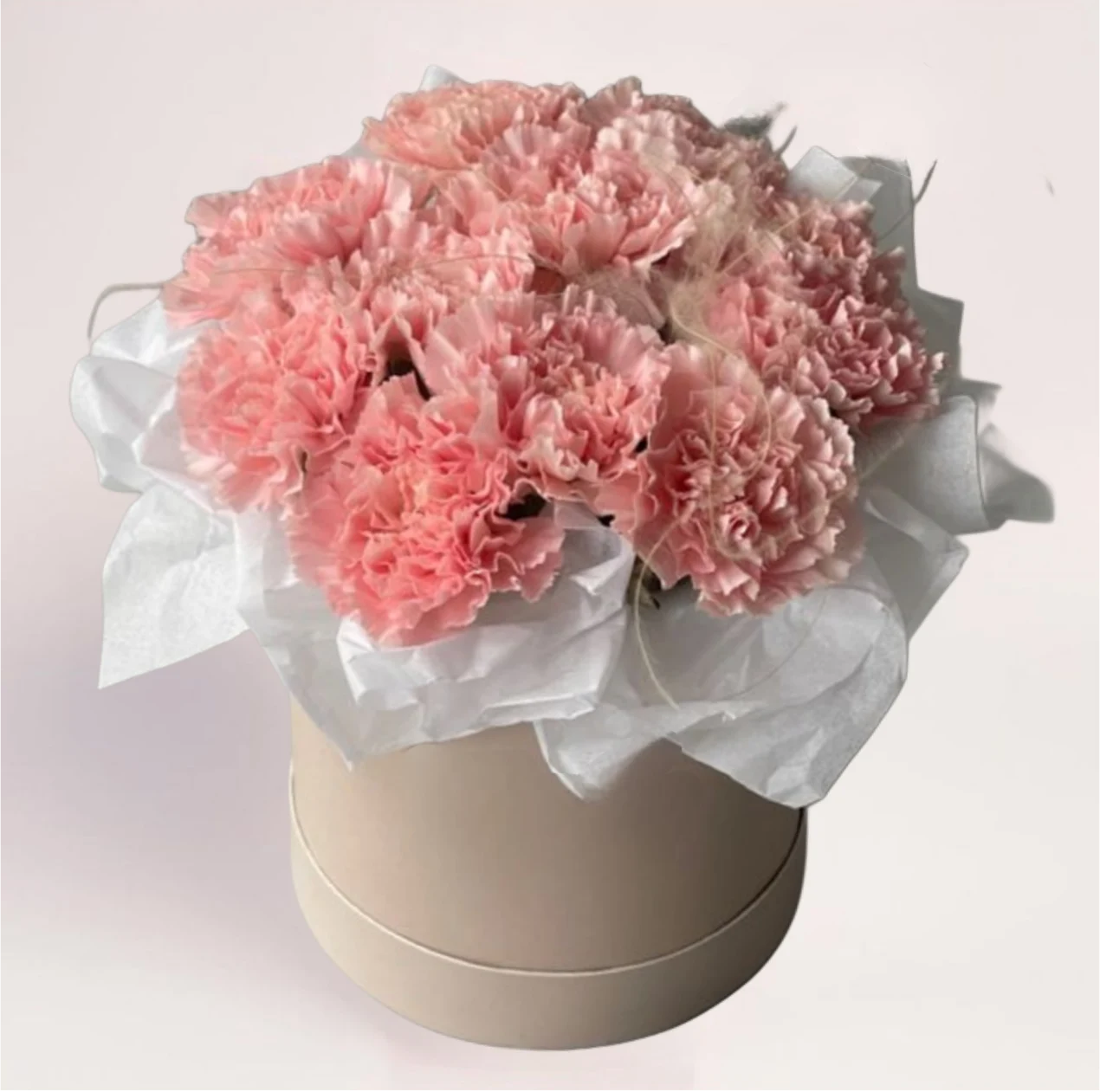 Цветы в коробке с розовыми гвоздиками с бесплатной доставкой — мягкая и аккуратная композиция в пастельных оттенках для нежного и тёплого подарка.