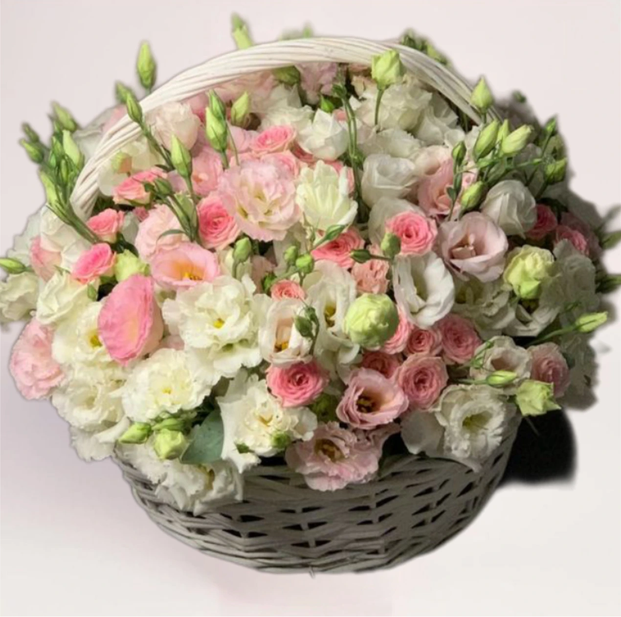 Цветы в корзине с эустомами и кустовыми розами в мягких пастельных оттенках. Воздушная композиция без вазы, аккуратно собранная и подходящая для дома или офиса. Бесплатная доставка по городу.
