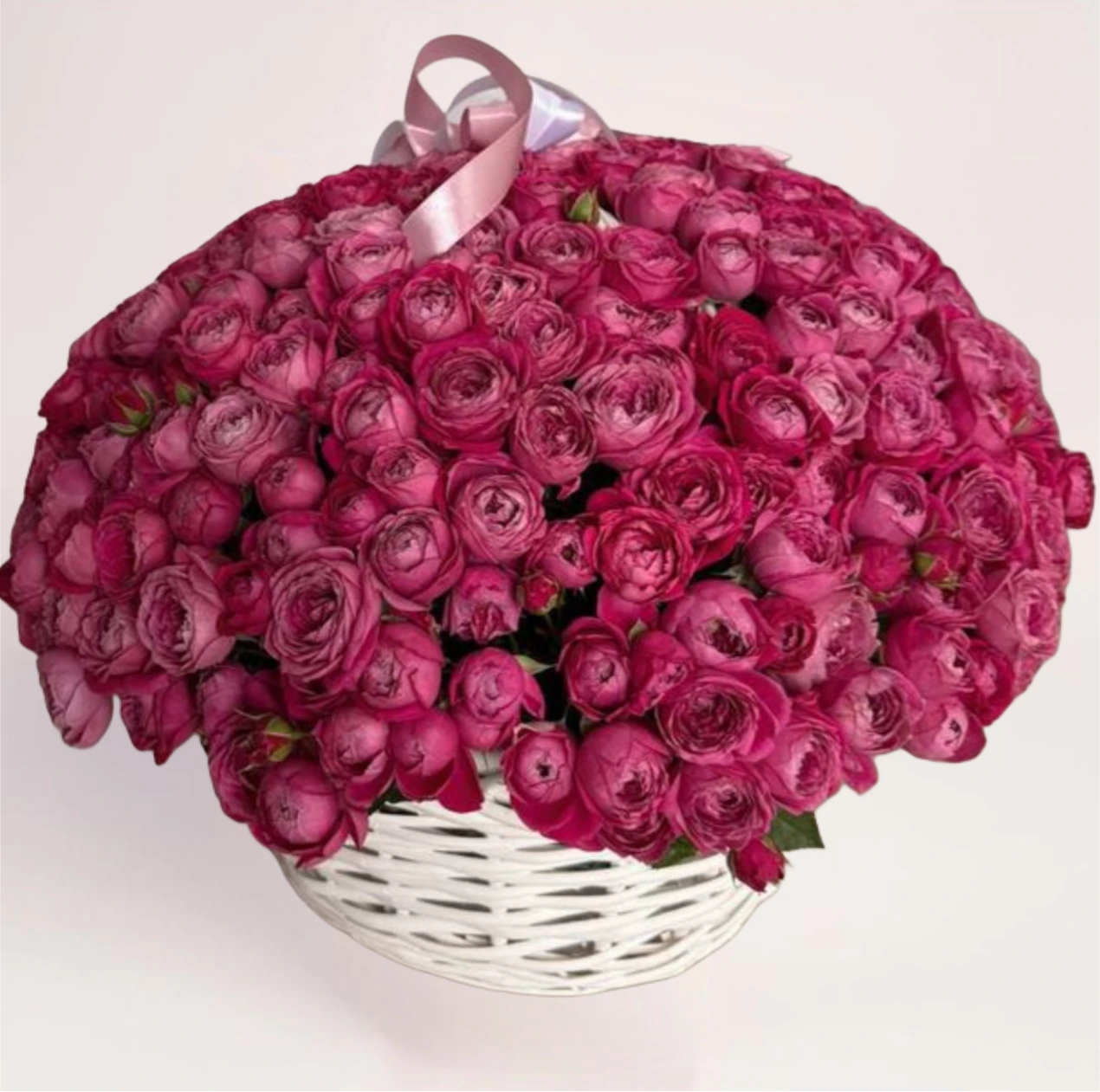 Корзина с малиновыми кустовыми розами с бесплатной доставкой — плотная и насыщенная композиция, полностью собранная из кустовых роз. За счёт большого количества бутонов корзина выглядит максимально объёмно, ярко и эффектно. Малиновый оттенок подчёркивает эмоции, страсть и искренность подарка.