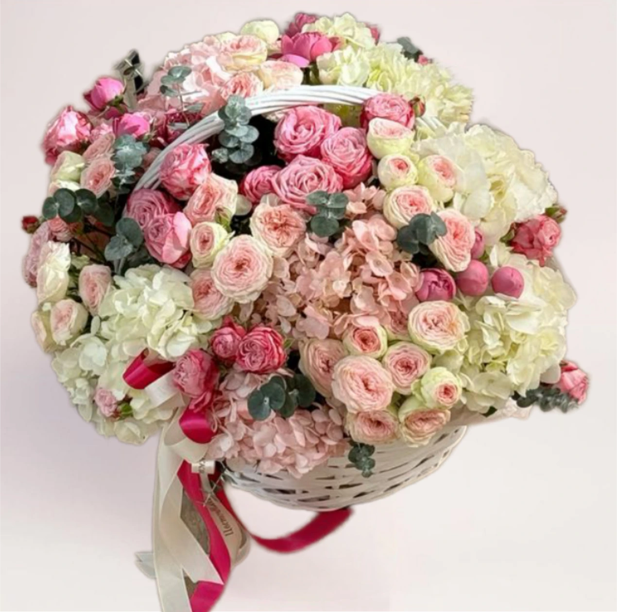 Корзина с пастельными розами и гортензией с бесплатной доставкой — объёмная и нежная цветочная композиция в светлых оттенках. Сочетание пионовидных роз, гортензии и декоративной зелени создаёт эффект «воздушного облака», который сразу привлекает внимание и выглядит дорого.