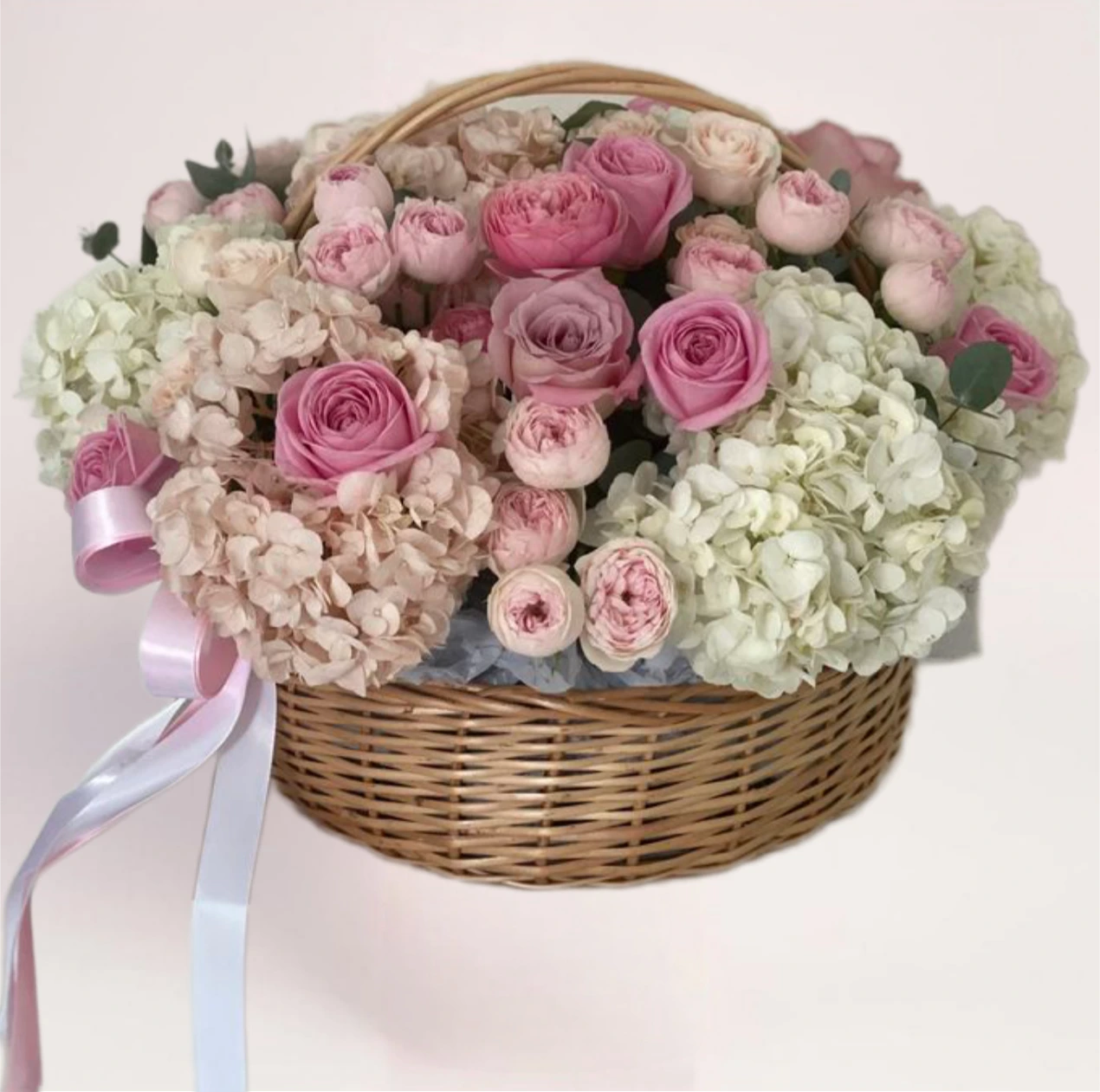 Корзина с розовыми розами, кустовыми розами и гортензией — элегантный цветочный подарок для тёплого и запоминающегося поздравления.