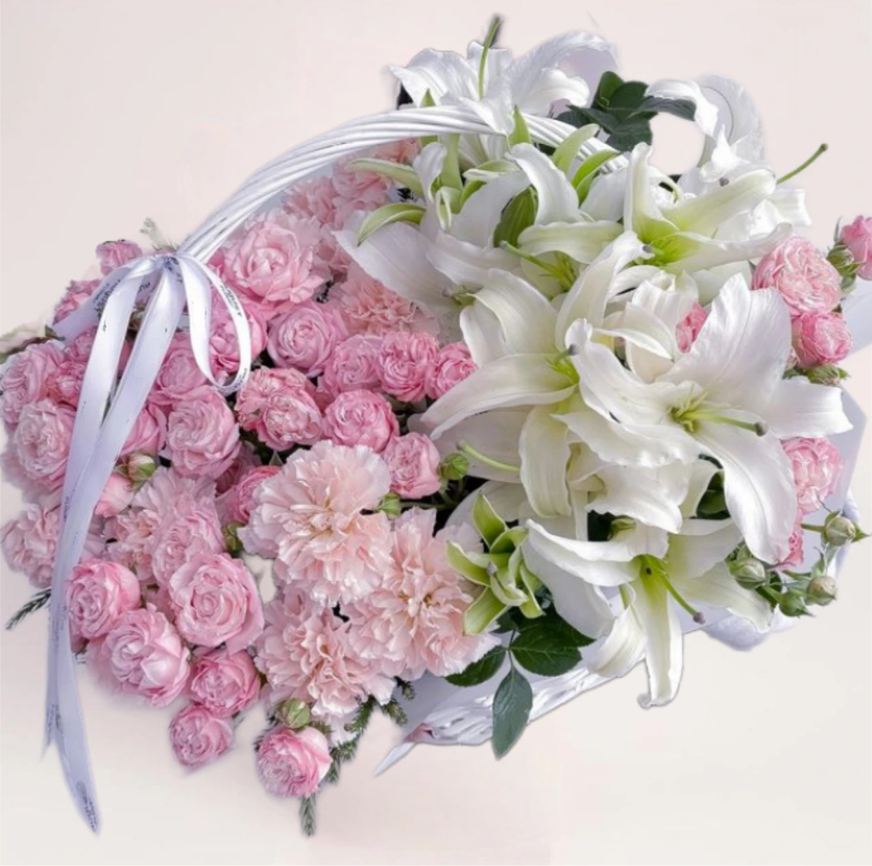 Корзина с розовыми розами и белыми лилиями с бесплатной доставкой — нежная и объёмная композиция в светлой гамме, которая передаёт тепло, заботу и искренние эмоции. Сочетание розовых оттенков и белых лилий делает корзину выразительной, но при этом лёгкой и аккуратной.
