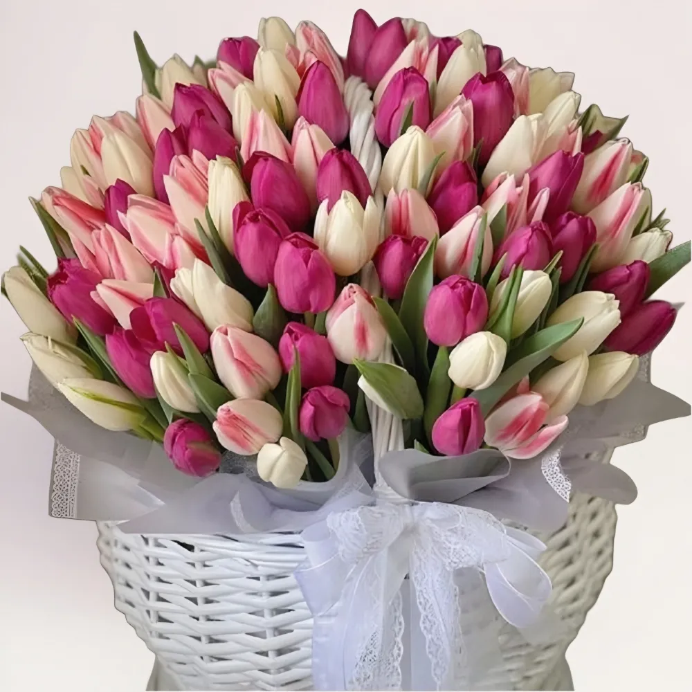 Эта корзина тюльпанов построена на мягком сочетании оттенков, которые создают ощущение легкости и изящества. Светлые бутоны визуально расширяют композицию, а яркие акценты добавляют глубину. Цветы размещены плотно, но без перегрузки — каждый бутон хорошо заметен, а общая форма выглядит ровной и симметричной. Благодаря этому корзина тюльпанов в Алматы выглядит объемной, но не тяжелой, и хорошо воспринимается как вблизи, так и на расстоянии.