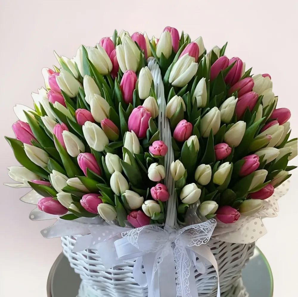 Эта корзина тюльпанов объединяет в себе четкую симметрию и равномерное заполнение пространства. Бутоны размещены плотно и одинаково по всей поверхности композиции, благодаря чему она выглядит собранно, аккуратно и очень презентабельно. Сочетание белых и нежно-розовых тюльпанов создает мягкий контраст без резких переходов. Такой дизайн часто ассоциируется с премиальными витринными композициями. Вы можете купить корзину с тюльпанами и выбрать удобное время доставки.