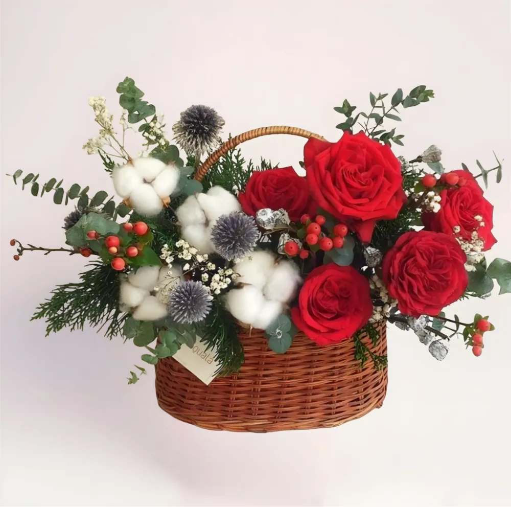 Новогодняя цветочная корзина с красными розами, хлопком и хвойным декором — стильный праздничный подарок с доставкой по городу.