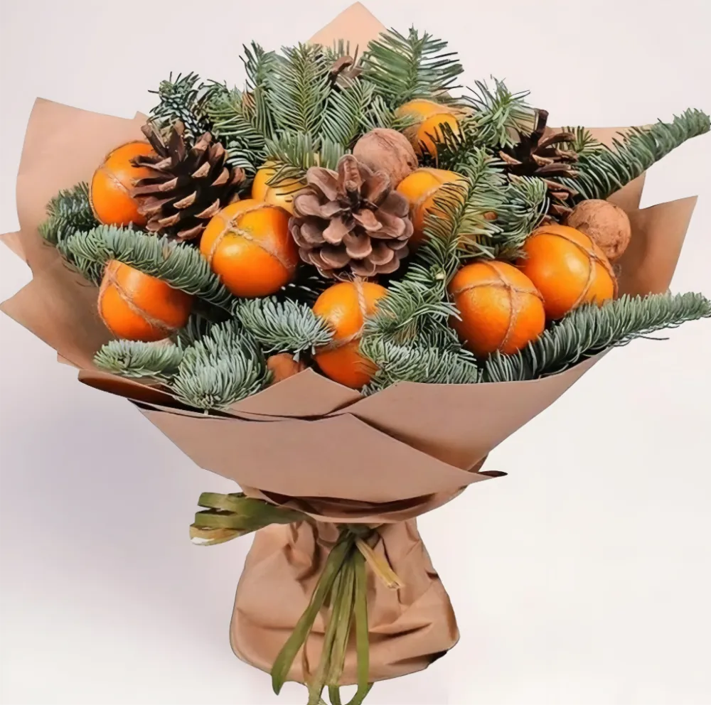 Новогодний букет «Зимний аромат» — стильный праздничный букет с выраженным зимним настроением. Композиция собрана на основе хвои с добавлением мандаринов, шишек и декоративных природных элементов. Букет выглядит объёмно, натурально и ассоциируется с уютом новогодних праздников.