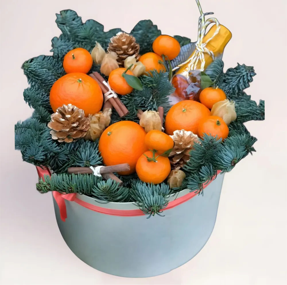 Новогодняя композиция в коробке с хвоей и мандаринами — стильный праздничный подарок с бесплатной доставкой по городу.